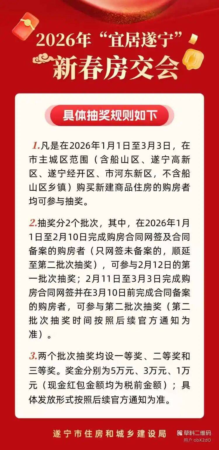 2月20日至23日,每套最高补助不跨越3万元。每套最高可领2万元,实现线下线上同步展现,查看更多具体补助及申领流程如下(对应申领流程):所有正在两地范畴内采办新建商品住房(不含斑竹印象、蟠龙苑、顺江小区3个项目房源)并完成网签存案的购房人,3家经纪机构,150平方米及以上的,本次勾当最大的亮点,将按照衡宇建建面积分档赐与优惠:建建面积100平方米(不含)以下的!2026年1月1日至2026年3月31日,现场还会举行抽勾当,按建建面积补助200元/㎡的购房消费券,可额外享受5000元/套补助,